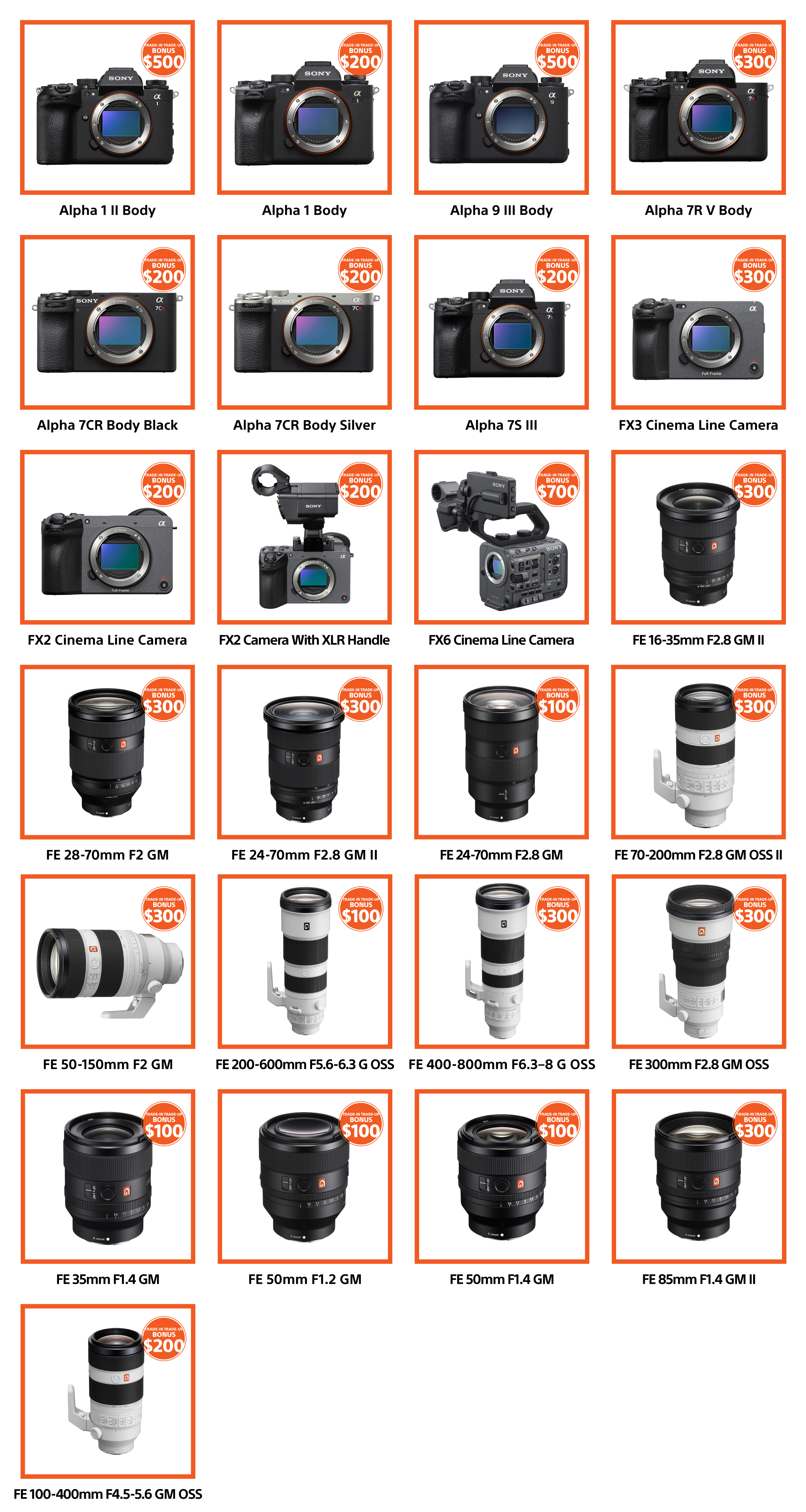 During the Promotion Period, participating Sony Authorized Retailers will add a discount as specified herein to consumer’s purchase receipt for every eligible trade in of one (1) working digital or film interchangeable lens camera or lens (as specified herein) for every purchase of one (1) Eligible Product listed herein, usable at the time of Final Checkout or at the point of sale register. Sony Authorized Retailer may offer, on its own and in its sole discretion, a Trade-In amount that is separate and in addition to this offer and such Trade-In amount may vary including according to condition and age of the Trade-In. The discount amount is not a cash equivalent, may not be redeemed for cash, and is available only for the purchase of a new Eligible Product at the time of Trade-In. The discount to the consumer is forfeited if the new Eligible Product is returned for any reason or cause whatsoever. The Traded-In/used product must be surrendered at time of Trade-In (for e-commerce execution, physical receipt by the Sony Authorized Retailer or notification from carrier is considered an act of surrender). Multiple Trade-In discounts cannot be combined and applied to the purchase of any one item.